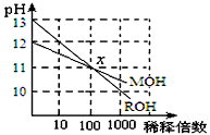 4、选择题 MOH和ROH两种一元碱的溶液分别加水稀释时,pH变化如图所示。下列叙述中不正确的是