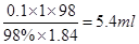 4、实验题 (4分)实验室需要0.1mol/L硫酸950ml,某同学用98%的浓硫酸(密度为1.84g·cm-3)配制: