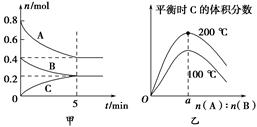 C(g)。200℃时,A、B、C的平衡浓度分别是0.2mol/L、0.1mol/L、0.1mol/L,根据化学平衡常数的定义得K=0.1mol/L/0.1mol/L×(0.2mol/L)2="25" L2/mol2,正确;C、当外界条件由200℃降温到100℃,原平衡一定被破坏,且正逆反应速率均减小,错误;D、由图乙可知温度升高,C的体积分数增大,说明升高温度,平衡正向移动,正向为吸热反应,ΔH>0,a值不确定,错误,答案选B。