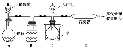 本题解析:(3)①因SiHCl3与水强烈反应,故A中产生的H2必须干燥,因此B中的试剂为浓H2SO4,且C烧瓶需加热,其目的是使SiHCl3汽化,加快其与H2的反应速率。②石英管中产生的物质应为硅,故D中有固体产生,由题给信息,制纯硅的反应条件为1 100~1 200 ℃,此温度下普通的玻璃容易软化。③因高温下H2与O2反应容易爆炸,故还应排尽装置中的空气。