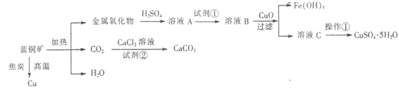 4、填空题 蓝铜矿主要含xCuCO3·yCu(OH)2,还含有少量Fe的化合物,工业上以蓝铜矿为原料制备Cu、CaCO3和CuSO4.5H2O。具体方法步骤如下: