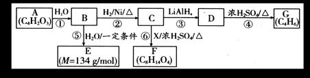4、填空题 A、B两种有机物均是有机合成的中间体,其中A的分子式为C4H7O2Br,B分子中含2个氧原子,其燃烧产物n(CO2) : n(H2O)=2:1,质谱图表明B的相对分子质量为188。A和B存在如下转化关系: