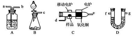 1、填空题 某实验小组用燃烧分析法测定某有机物中碳和氢等元素的含量,随后又对其进行了性质探究。将已称量的样品置于氧气流中,用氧化铜作催化剂,在高温条件下样品全部被氧化为水和二氧化碳,然后分别测定生成的水和二氧化碳。实验可能用到的装置如下图所示,其中A、D装置可以重复使用。