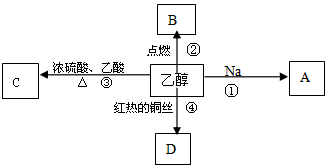 4、填空题 乙醇是生活中常见的有机物,能进行如图所示的多种反应,A、B、C、D都是有机物。