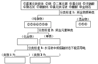 (1)简单分类方法有树状分类法和交叉分类法,该分类是树状分类法;铜、二氧化碳、氯化铵、、熟石灰、碳酸钙、、醋酸、金刚石中单质是铜和金刚石,化合物中不能导电的是二氧化碳,二氧化碳溶于水虽然可以导电,但实际导电的是碳酸,二氧化碳本身不能导电,属于非电解质。
