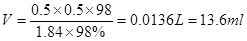 1、实验题 欲用98%的浓硫酸(g=1.84g·cm-3)配制成浓度为0.5mol·L-1的稀硫酸500ml。