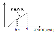 本题解析:向用盐酸酸化的MgCl2、FeCl3混合溶液中逐滴滴入NaOH溶液,首先发生反应NaOH+HCl=NaCl+H2O,即为图象中0-amL,沉淀的质量为0g;FeCl3只能在酸性较强的溶液中存在,当酸性减弱时,会转化为Fe(OH)3沉淀,从amL开始,bmL时沉淀完全.bmL时,溶液仍然呈酸性,到cmL时,才开始产生Mg(OH)2沉淀,令氢氧化钠浓度为xmol/L,Fe3+完全沉淀消耗氢氧化钠为(b-a)mL,结合Fe3++3OH-═Fe(OH)3↓可知,溶液中n(Fe3+)=×(b-a)×10-3Lxmol/L,