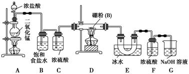 本题解析:本实验属于物质制备与检验综合设计实验,涉及制备气体、净化气体、干燥气体和尾气处理。(1)见答案。(2)三氯化硼的沸点低,易挥发,需要冷却产品。B装置的作用是吸收Cl2中混有的HCl,由题给资料知,硼与氯化氢反应生成的产物中有氢气,加热氢气和氯气的混合气体,易发生爆炸。(3)硼与氯气在加热条件下反应生成三氯化硼。F装置用于吸收水蒸气,避免G装置中的水蒸气进入U形管。G装置可以盛装氢氧化钠溶液吸收尾气,故实验中可以用一个盛装碱石灰的干燥管来代替F+G装置。(4)因硼与铝的性质相似,硼酸的化学式为H3BO3,类似铝酸(H3AlO3)。因三氯化硼遇水能反应,故实验室应密封保存三氯化硼。(5)若不先排尽装置中的空气,O2会与硼反应:4B+3O2