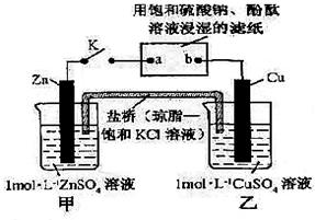 本题解析:将装置中K闭合,该装置构成原电池,其中甲池中Zn是负极,电极上发生氧化反应,乙池中Cu是正极,发生还原反应,依次来判断;A、原电池中阳离子向正极移动,即向乙池移动,正确;B、电子沿Zn→a,在a、b上是溶液中的离子放电,电子不能直接由a→b,错误;C、硫酸钠润湿的滤纸是电解池,b是阳极,OH-放电发生氧化反应4OH-—4e-=O2↑+2H2O,正确;D、在a处是阴极,溶液中的H+ 得到电子,c(H+) 减小,c(OH-)增大,a处滤纸变红色,正确。