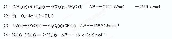 2、填空题 (1)家用液化石油气的主要成分之一是丁烷(C4H10),当10 kg丁烷完全燃烧并生成二氧化碳气体和液态水时,放出的热量为5×105 kJ。试写出丁烷燃烧的热化学方程式: 。已知1mol液态水汽化时需要吸收44 kJ热量,则反应C4H10(g)+6.5O2(g)=4CO2(g)+5H2O(g)的ΔH= 。