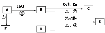 3、填空题 已知有机物A、B、C、D、E、F有以下转化关系。A的产量是衡量一个国家石油化工生产水平的标志;D能使石蕊试液变红;E是不溶于水且具有香味的无色液体,相对分子质量是C的2倍;F是高分子聚合物,常用于制食品包装袋。结合下图关系回答问题: