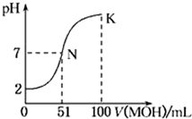 D.若K点对应的溶液的pH=10,则有c(MOH)+c(OH-)-c(H+)=0.005mol/L