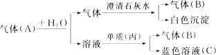 ②气体A溶于水生成的溶液与单质丙反应,得到蓝色溶液应为铜盐溶液,可能是单质铜溶于硝酸中,生成蓝色硝酸铜溶液。那么溶于水能生成硝酸溶液的气体应为NO2,所以气体A中可能有NO2。