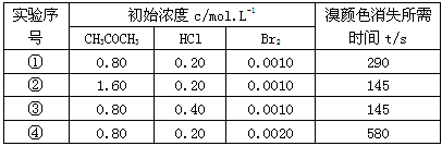 )来研究反应物浓度与反应速率V(Br)的关系。反应速率通过测定溴的颜色消失所需的时间来确定。在一定温度下,获得如下实验数据