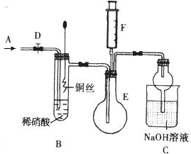 4、实验题 为探究铜与稀硝酸反应产生的气体主要是NO,某课外活动小组设计了下列实验。图中D为止水夹,F是装有一半空气的注射器,其中加热装置和固定装置均已略去。