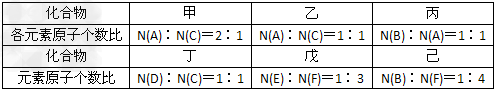 2、推断题 A、B、C、D、E、F六种短周期元素的原子序数依次增大。A、D同族,B、C同周期;C是F不同周期的邻族元素;B原子最外层电子数比其次外层电子数多2;A、B两元素的核电荷数之差等于它们的原子最外层电子数之和;E和F的原子序数之和为30。由上述六种元素中的两种元素组成的甲、乙、丙、丁、戊、己六种化合物如下图所示:?