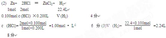 4、计算题 (8分)将6.50g锌投入200mL某浓度的盐酸中,锌和盐酸恰好完全反应。求: