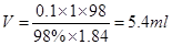 1、填空题 (10分)质量为34 g的NH3其物质的量是?mol,在标准状况下的体积约为?L 。0.1 mol H2S中有约?个氢原子;相同质量的NH3和H2S中分子个数比为?。配制100 mL浓度为1 mol·L-1的稀硫酸,需要用98%密度为1.84 g/cm3的浓硫酸?mL。