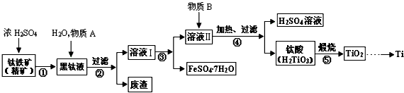 4、填空题 具有硬度大、熔点高、耐酸腐蚀而被应用于航空、电子等领域,由钛铁矿(主要成份是FeTiO3,钛酸亚铁)提取金属钛并获得副产品FeSO4·7H2O的工艺过程如下