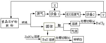 5、填空题 工业上用重晶石(主要成分BaSO4)为原料制备BaCl2和锌钡白,生产过程中会产生大量废气(主要成分为CO2、CO及少量SO2和硫蒸气等),为防止污染空气并提高原料利用率,生产中采用下述工艺流程
