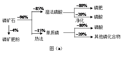 磷矿石主要以磷酸钙〔Ca3(PO4)2·H2O〕和磷灰石〔Ca3(OH)(PO4)3〕等形式存在。图(a)为目前国际上磷矿石利用的大致情况,其中湿法磷酸是指磷矿石用过量硫酸分解制备磷酸。图(b)是热法磷酸生产过各中由磷灰石制单质磷的流程。