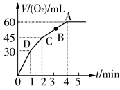 4、填空题 加0.1 mol MnO2粉末于50 mL过氧化氢(H2O2,ρ=1.1 g· mL-1)中,在标准状况下放出气体的体积和时间的关系如图所示。