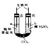 ,分别在U形管两端小心倒入饱和食盐水和饱和稀硫酸溶液,并使a、b两处液面相平,然后分别塞上插有生铁丝的塞子,密封好,放置一段时间后,下列有关叙述错误的是