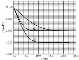 B(g)+ C(g)分别在三种不同实验条件下进行,但起始浓度相同,均为c(A)=0.100mol/L、c(B)=0.020mol/L及c(C)=0.020mol/L。反应物A的浓度随时间的变化如下图所示: