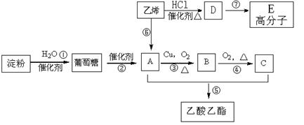 本题解析:淀粉水解生成葡萄糖,葡萄糖在催化剂的作用下分解生成乙醇,则A是乙醇,乙醇含有羟基,在催化剂的作用下发生氧化反应生成乙醛,即B是乙醛,乙醛含有醛基,发生氧化反应生成乙酸,乙酸含有羧基,和乙醇发生酯化反应生成乙酸乙酯。乙烯含有碳碳双键,和水加成生成乙醇。由于D能发生加聚反应生成高分子化合物E,所以乙醇和氯化氢发生的是取代反应,生成氯乙烯,氯乙烯发生加聚反应,生成聚氯乙烯。