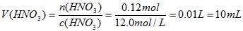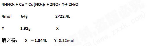 1、计算题 1.92g Cu与足量的12.0 mol/L的浓硝酸完全反应。求: