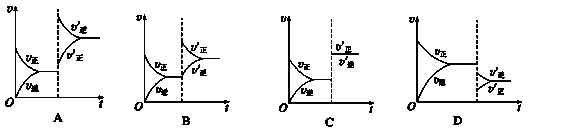 本题解析:(1)加入催化剂,正逆化学反应速率同等程度的加快,化学平衡不移动;(2)升高温度,化学反应速率都离开原来的速率点迅速加快,化学平衡向着吸热方向进行,即向着逆方向进行,逆反应速率快于正反应速率;(3)增大反应容器体积相当于减小压强,此时正逆反应速率都迅速减慢,化学平衡向着气体体积增大的方向即向着逆方向进行,正反应速率慢于逆反应速率,(4)增大反应物氧气的浓度,正逆化学反应速率加快,化学平衡向着正反应方向进行,逆反应在原来基础上加快,正反应速率迅速加快,且快于逆反应速率。