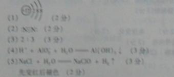 5、填空题 甲、乙、丙、丁、戊为原子序数依次增大的短周期元素。甲、丙处于同一主族,丙丁戊处于同一周期,戊原子的最外层电子数是甲、乙、丙原子最外层电子数之和。甲、乙组成的常见气体X能使湿润的红色石蕊试纸变蓝;戊的单质与X反应能生成乙的单质,同时生成两种溶于水均呈酸性的化合物Y和Z,0.1mol/L的Y溶液pH>1;丁的单质既能与丙元素最高价氧化物的水化物的溶液反应生成盐,L也能与Z的水溶液反应生成盐;丙、戊可组成化合物M。