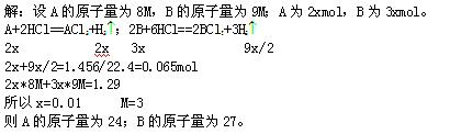 3、计算题 由第IIA族金属单质A和第IIIA族金属单质B组成的混合物1.29g ,用过量的盐酸其完全溶解后生成的氢气