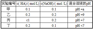4、选择题 常温下,将一元酸HA和NaOH溶液等体积混合,两种溶液的浓度和混合后所得溶液的pH如下表: