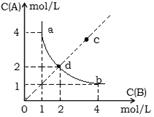 本题解析:结合反应方程式可知该反应的化学平衡常数的表达式为K=1/c(A)×c(B),所以ToC时K=1/4;B项c点未达平衡,结合图像将c点与b点比较,横坐标稍小于4,平衡状态下纵坐标应该稍大于1,可知反应向正向进行;D项由图像可知点a、b、d点所在曲线为平衡状态。