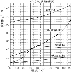 已知:NaHCO3溶液的pH约为8~9,Na2CO3溶液的pH约为11~12。溶解过滤工序产生的滤液中含钠、钾和铝的可溶性盐类,钙和硅等其他杂质在滤渣霞石泥中。部分物质的溶解度见右图。