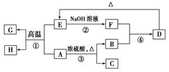 1、填空题 已知A、B、C、D、E、F、G、H可以发生如图所示的转化,反应中部分生成物已略去。其中,A、G为同一主族元素的单质,B、C、H在通常情况下为气体,化合物C是一种形成酸雨的大气污染物。