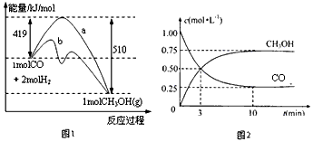 图1表示该反应进行过程中的能量变化(曲线a未使用催化剂,曲线b使用催化剂)。图2表示一定温度下,在体积为2L的密闭容器中加入4mol H2和一定量的CO后,CO和CH3OH(g)的浓度随时间变化情况。