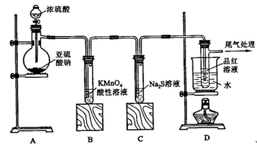 本题解析:该实验为制备SO2并检验其性质,则A为SO2的发生装置,B、C、D为检验装置;B中为酸性高锰酸钾溶液。它具有强氧化性能把SO2氧化成H2SO4,它本身被还原为Mn2+,溶液的紫色变浅或褪去。故可用于检验SO2的还原性;C中为硫化钠溶液,其具有强还原性二者发生反应产生难溶于水的S单质,看见溶液变浑浊,故可用于检验SO2的氧化性;D中为品红溶液,可检验SO2的漂白性;SO2的漂白是结合漂白,产生的无色物质不稳定,受热容易分解而恢复原来的红色。SO2是大气污染物,它是酸性氧化物,可用碱性溶液NaOH来消除其危害。2的实验室制法及性质的检验。