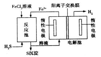 ②反应池中是硫化氢与氯化铁发生的氧化还原反应,生成亚铁离子和S单质及氢离子,离子方程式是2Fe3+ + H2S="=" 2Fe2++S↓+2H+;得到的溶液为氯化亚铁和氯化氢进入电解池,则电解氯化亚铁和氯化氢的混合液得到氢气和氯化铁,所以电解池中发生反应的离子方程式是2Fe2+ + 2H+