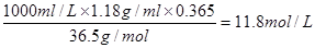 4、计算题 现有50mL密度为1.18g/mL、质量分数为36.5%的浓盐酸:求