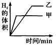 3、选择题 将0. 01mol相同颗粒大小的镁粉、铁粉分别加入到盛有50mL 1mol/L硫酸的两烧杯甲和乙中,下图能正确反映实验结果的是