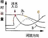 本题解析:本题结合社会实践活动考查环境污染与保护等相关基础知识,具有很好的探究性。(1)水体自身净化即让污染物逐渐减少,氧气溶解量则先因被消耗而减少后又逐渐恢复,故水中DO变化曲线为C;(2)含磷物质的排放会增加水生植物所需的营养,产生水华、赤潮等现象,称之为“水体富营养化”;(3)水体的污染源主要是工业生产尤其是化工厂排放的废水,农业上使用的化肥、农药,城市居民生活污水等,所以应取这些具有代表性的地区的水样;(4)①比色法显然类似pH试纸的原理,铵或氨的浓度高,加检测试剂后其颜色就深;②氨的含量异常偏高,NO2—和NO3—含量略偏高,因为NO2—和NO3—是NH3经逐步氧化产生的,其原因显然是BC。