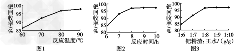 (3)钯精渣中钯的回收率高低主要取决于王水溶解的操作条件,已知反应温度、反应时间和王水用量对钯回收率的影响如下图1~图3所示,则王水溶解钯精渣的适宜条件(温度、时间和王水用量)为________、________、________。