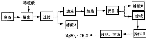 4、填空题 硫酸镁又名泻盐,是一种重要的无机化工产品,用途十分广泛。某化工厂从该厂的工业废渣(主要成分是MgCO3,另外还有CaCO3、SiO2等杂质)中提取回收MgSO4.7H2O的主要工艺流程如下。