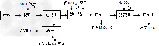 2、填空题 2006年世界锂离子电池总产量超过25亿只,锂电池消耗量巨大,对不可再生的金属资源的消耗是相当大的,回收利用锂资源成为重要课题。某研究小组对某废旧锂离子电池正极材料(图中简称废料,成份为LiMn2O4、石墨粉和铝箔)进行回收研究,工艺流程如下: