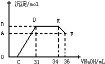 滴加NaOH体积为31ml时,发生反应为①H++OH-=H2O,②Fe3++3OH-=Fe(OH)3↓,Al3++3OH-=Al(OH)3↓,则C点氢氧化钠溶液的体积为31mL-0.024mol×34mol/L×1000mL/L-0.008mol×34mol/L×1000mL/L=7mL,