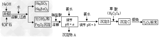 4、填空题 “中东有石油,中国有稀土”。稀土金属是我国战略性资源,应加以保护。稀土金属是周期表中IIIB族中钪、钇和镧系十七种元素的总称,都是很活泼的金属,性质极为相似,常见化合价为+3价。钇(Y)元素是激光和超导的重要材料。我国蕴藏着丰富的钇矿石(Y2FeBe2Si2O10),以此矿石为原料生产氧化钇(Y2O3)的主要流程如下