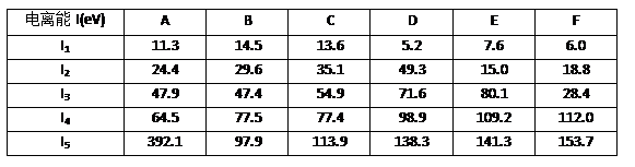 (5)下表为原子序数依次增大的短周期元素A~F的第一到第五电离能数据。