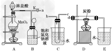 (2)实验开始先点燃A处的酒精灯,打开旋塞K,让Cl2充满整个装置,再点燃D处的酒精灯,Cl2通过C装置后进入D,D装置内盛有碳粉,发生氧化还原反应,生成CO2和HCl(g),发生反应的化学方程式为____________________________.为了使C装置发挥更好的作用,可向烧杯中加入浓硫酸,加入浓硫酸的作用是_______________________.